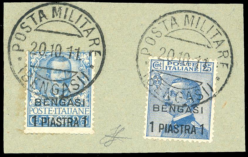 BENGASI 1901/11 - Soprastampati, i due valori emessi (1,2), perfetti, usati su frammento con annullo Posta Militare Bengasi 20/10/1911. Ferrario.