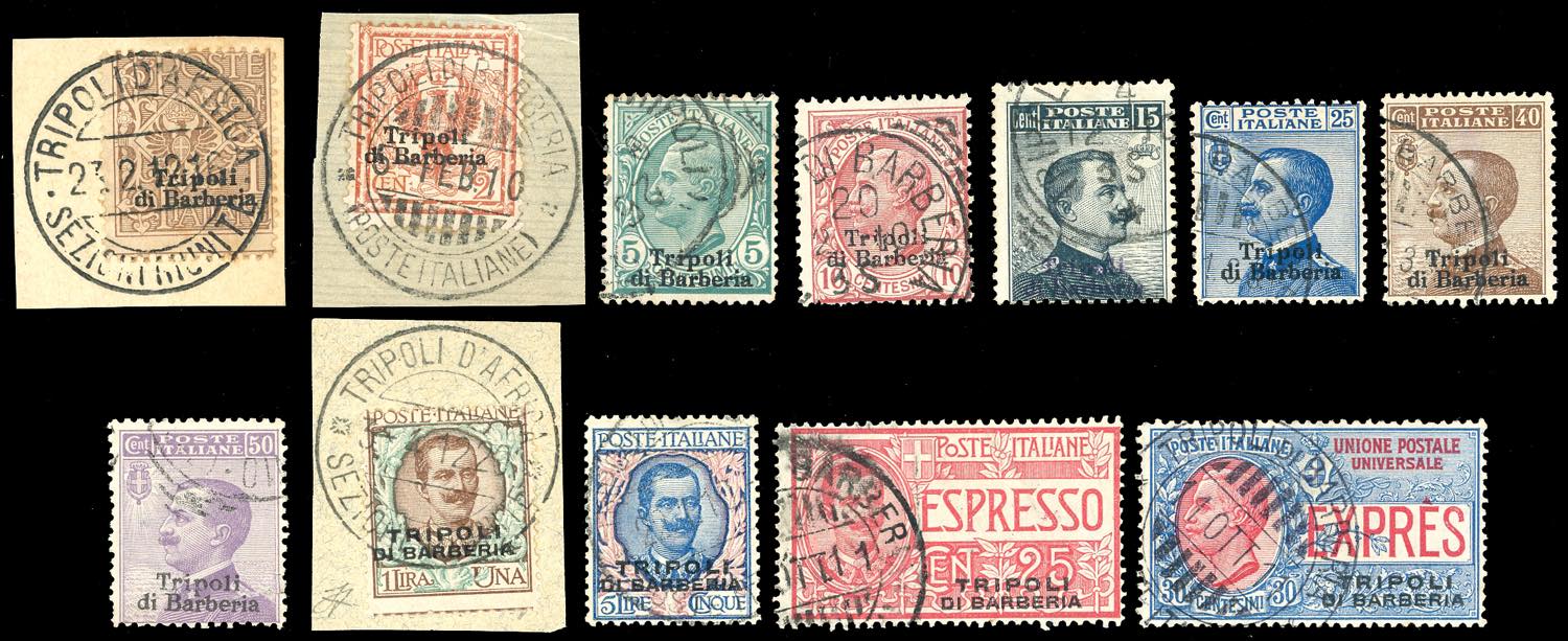TRIPOLI DI BARBERIA 1909 - Soprastampati, serie completa (1/10), usati, con annulli originali, perfetti ad eccezione dei valori da 2 cent., ... Leggi tutto