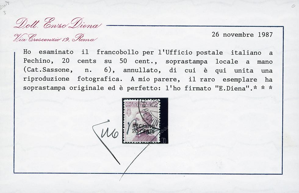 PECHINO 1917 - 20 cents su 50 cent. Michetti, soprastampa locale a mano (6), usato, perfetto. Splendido ed estremamente raro. G.Oliva, cert. Enzo Diena 1987.