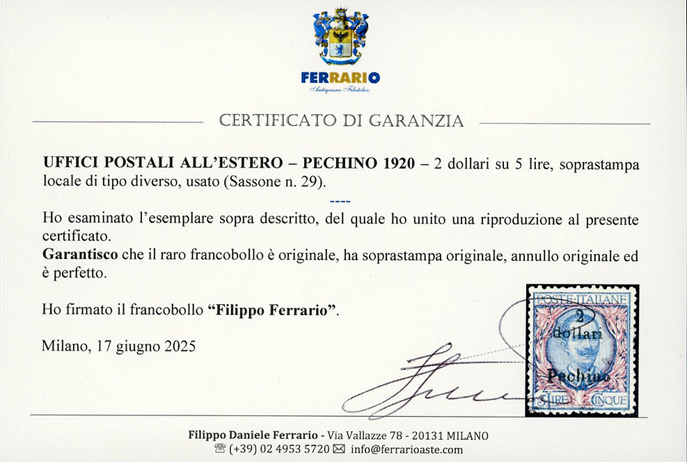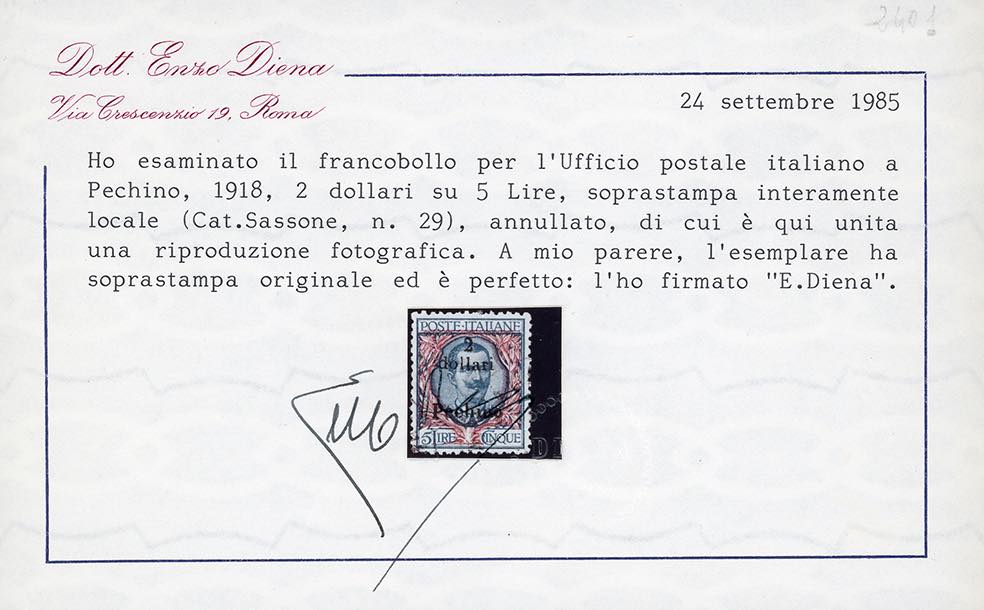 PECHINO 1920 - 2 dollari su 5 lire, soprastampa locale di tipo diverso (29), usato, perfetto. Raro e di ottima qualità. Alberto Diena, cert. Ferrario ed Enzo Diena.