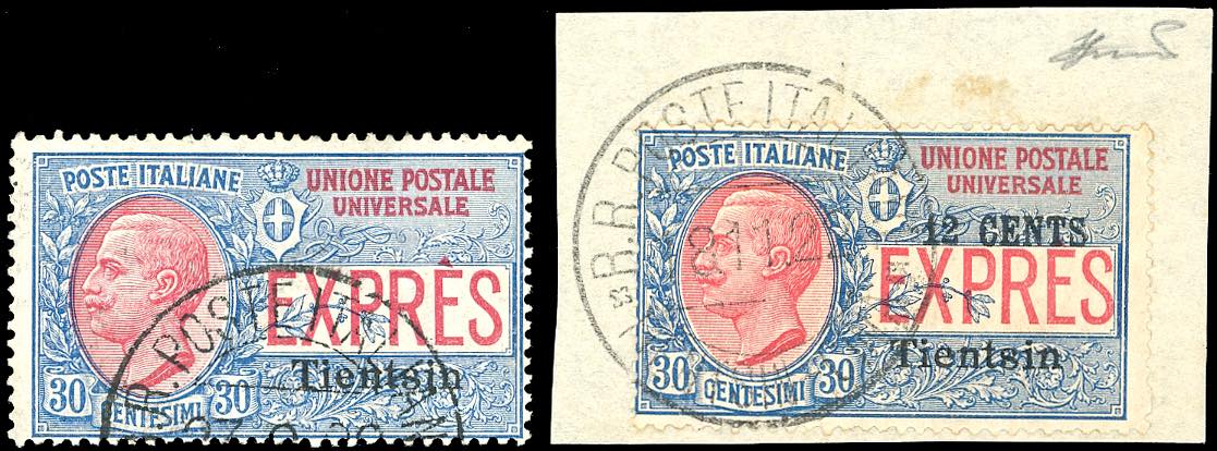 TIENTSIN ESPRESSI 1917/18 - I due valori emessi (1,2), usati con annulli originali, perfetti. Chiavarello il primo, Ferrario entrambi.