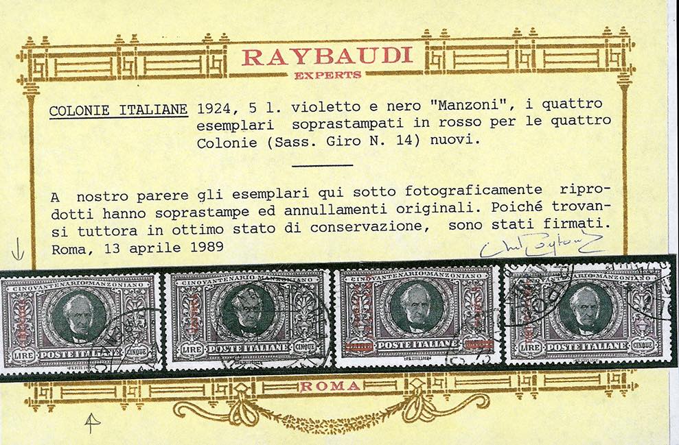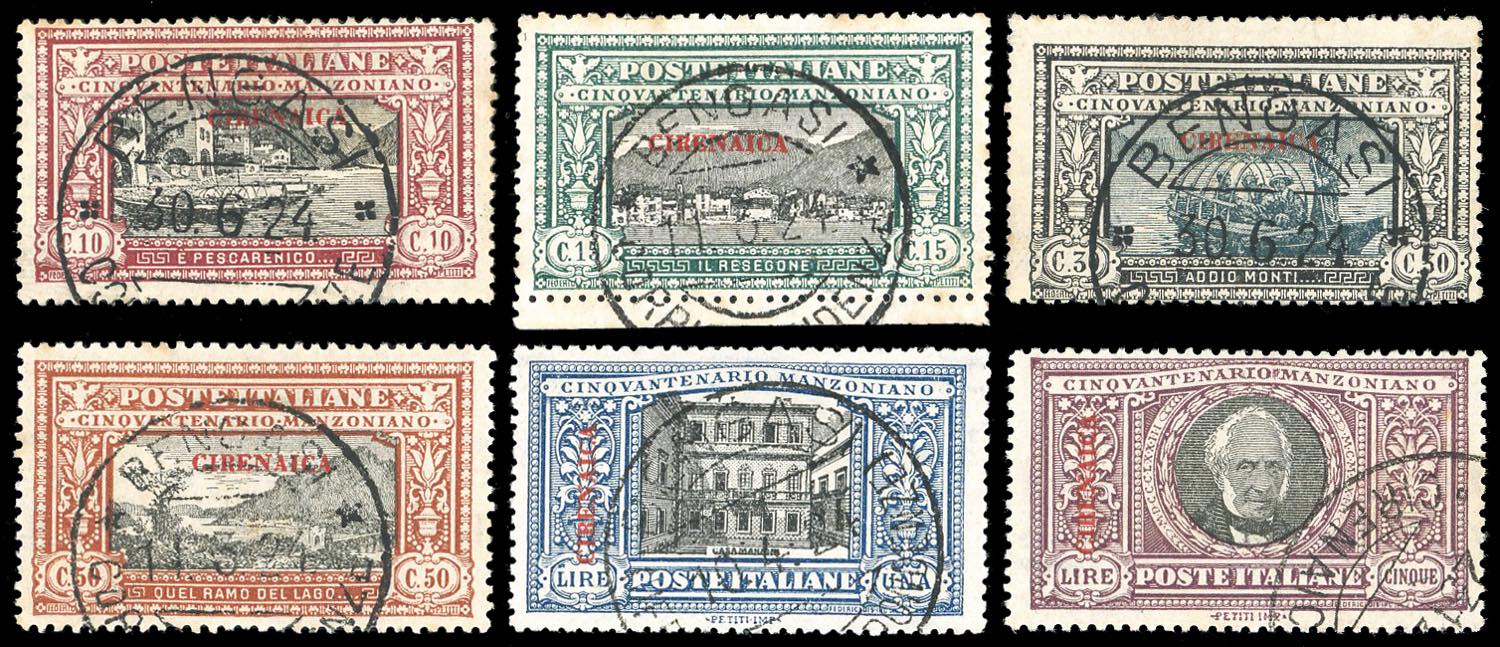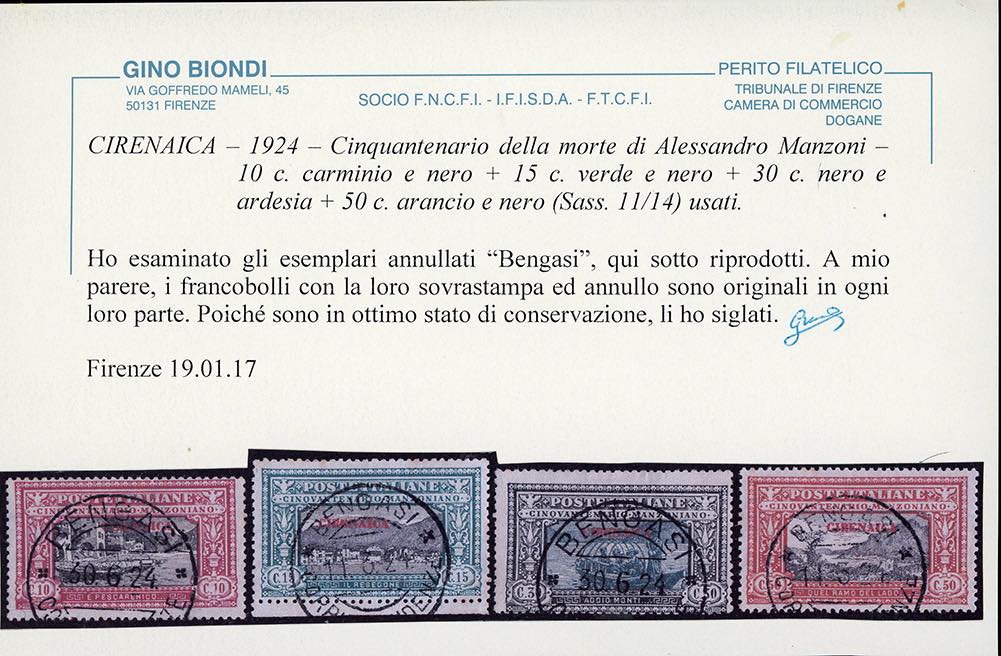 1924 - Manzoni, serie completa (11/16), perfetti, usati con annulli originali. A.Diena e Fiecchi per l'1lira, E.Diena, Raybaudi, Chiavarello per il 5 lire, cert. Ferrario per la serie, fotocopia cert. Oro Raybaudi per il 5 lire.