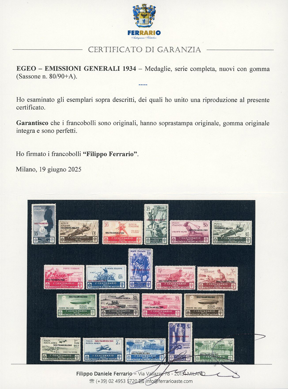 1934 - Medaglie, serie completa (80/90+A), nuovi, gomma originale integra, perfetti. Raybaudi per gli alti valori di posta aerea, cert. Ferrario per la serie.