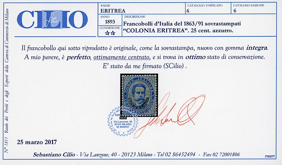 1893 - Prima emissione, soprastampati, serie completa (1/11), nuovi, gomma originale integra, perfetti. Alti valori ben centrati. Ottima qualità. Cert. Ferrario per gli alti valori, cert. Cilio per il 25 cent.