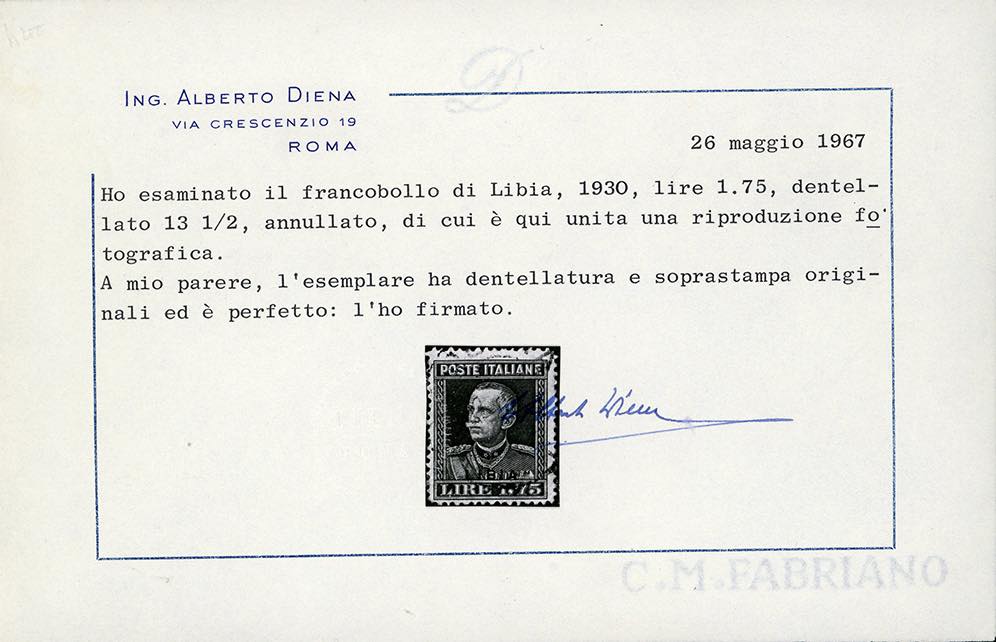 1930 - 1,75 lire bruno Vittorio Emanuele III, dent. 13 3/4 (94), usato, perfetto. Molto raro. Firmato Ferrario, cert. A.Diena e Sorani.