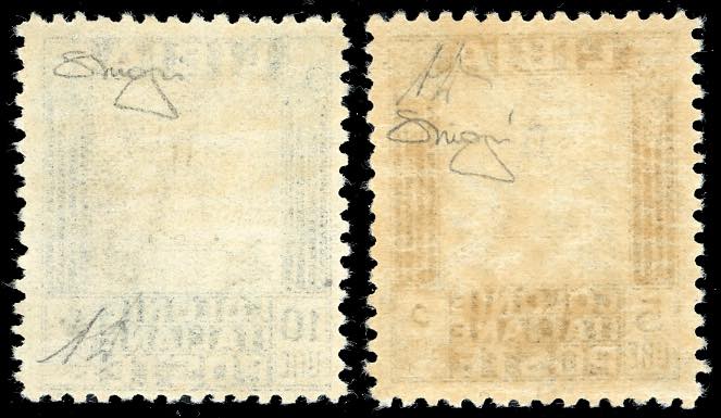 1937 - 5 lire, 10 lire Pittorica, dent. 11 (144,145), ottima centratura per il raro 5 lire, gomma originale integra, perfetti. Molto belli. A.Diena, cert. Oro Raybaudi.