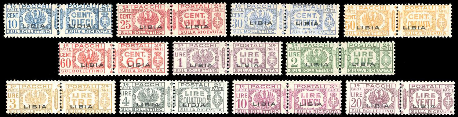 PACCHI POSTALI 1927/37 - Fascio al centro, soprastampati, serie completa (14/24), nuovi, gomma originale, lieve traccia di linguella, perfetti. Ottima qualità. Alti valori cert. Caffaz.