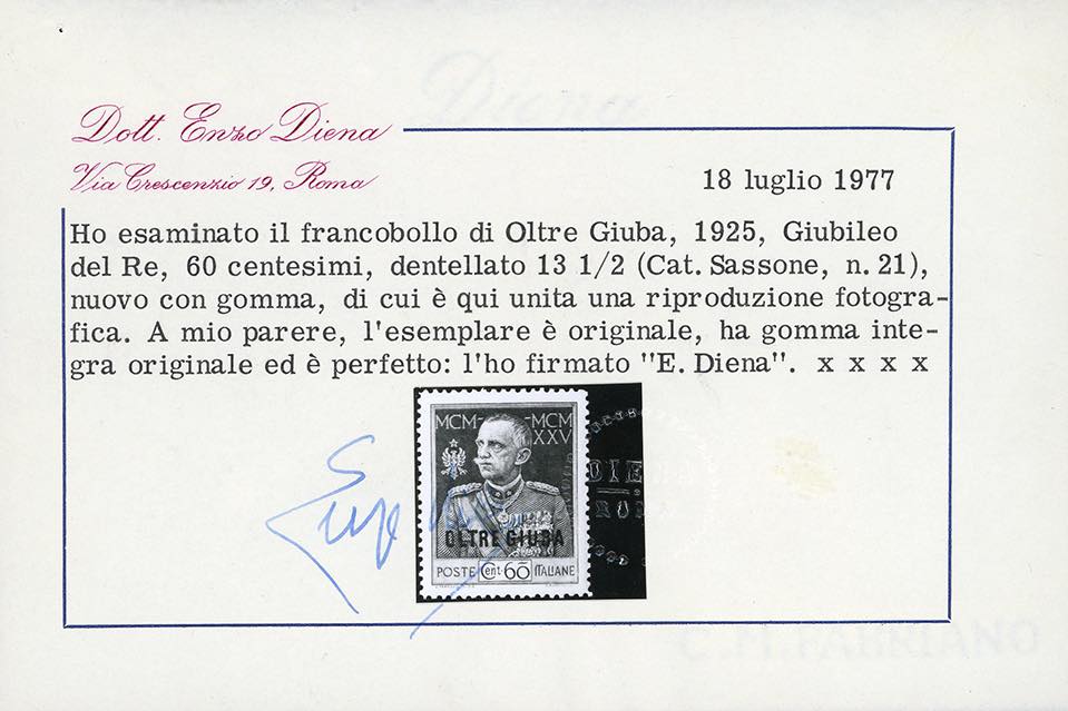 1925 - 60 cent. Giubileo, dent. 13 1/2 (21), ottima centratura, nuovo, gomma originale integra, perfetto e di eccezionale freschezza. Splendido, uno dei migliori esemplari noti di questo raro francobollo. Grioni, cert. E.Diena e cert. Finanziario Bolaffi 100%.