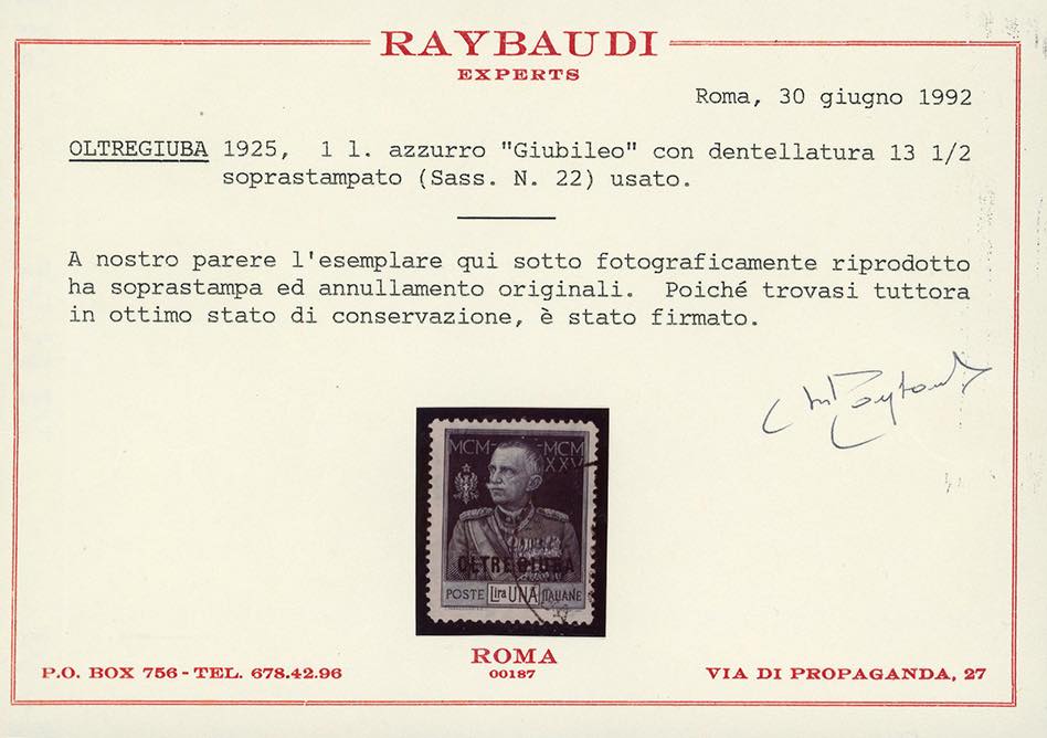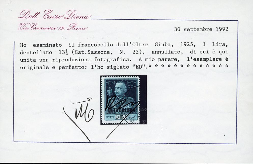 1925 - 1 lira Giubileo, dent. 13 1/2 (22), perfetto, usato con annullo originale. Raro. Ferrario, cert. E.Diena, Raybaudi.