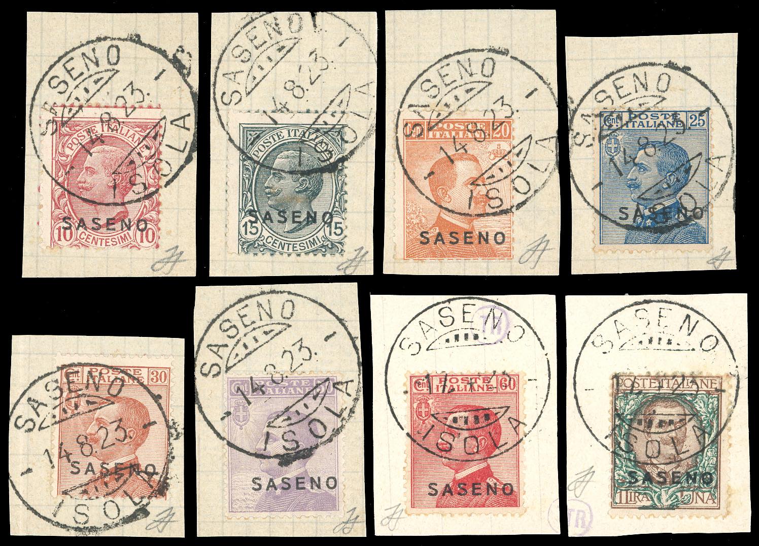 1923 - Soprastampati, serie completa (1/8), perfetti, usati su frammento con annullo originale. Ferrario.