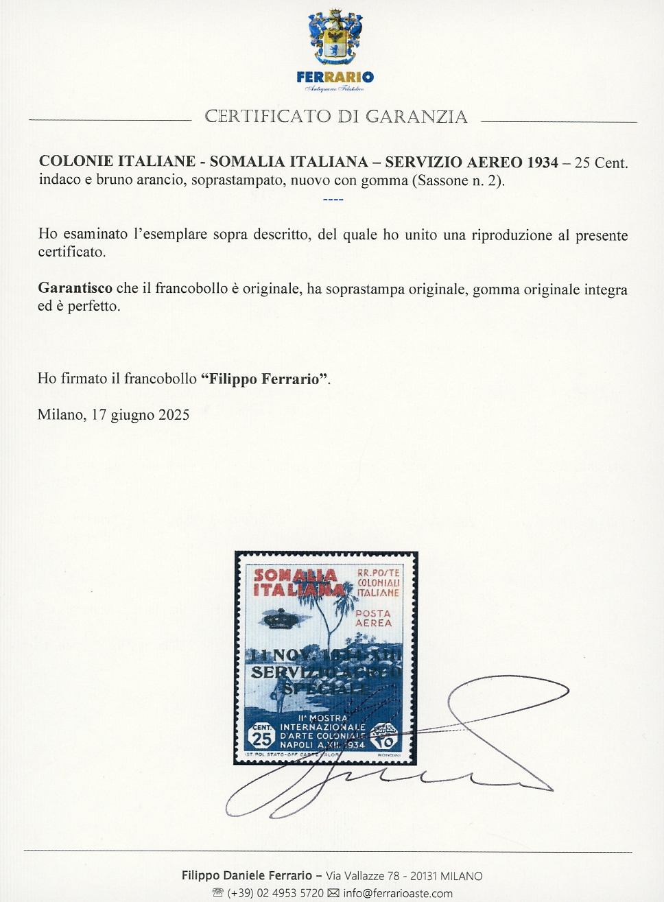 SERVIZIO AEREO 1934 - 25 cent. soprastampato (2), nuovo, gomma originale integra, perfetto. Cert. Ferrario.