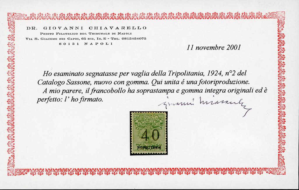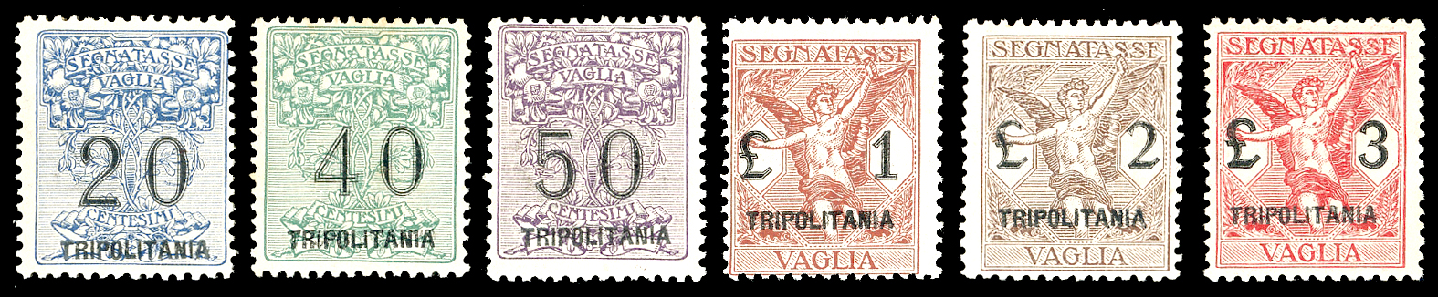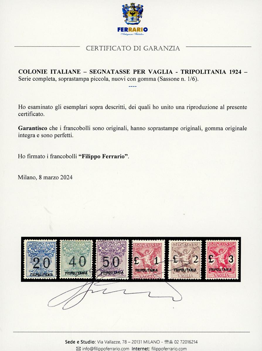 SEGNATASSE VAGLIA 1924 - Serie completa, soprastampa piccola (1/6), nuovi, gomma originale integra, perfetti. Molto freschi e il raro n. 2 con centratura sopra la media. Ferrario, il n. 2 firmato anche A.Diena e cert. Chiavarello.