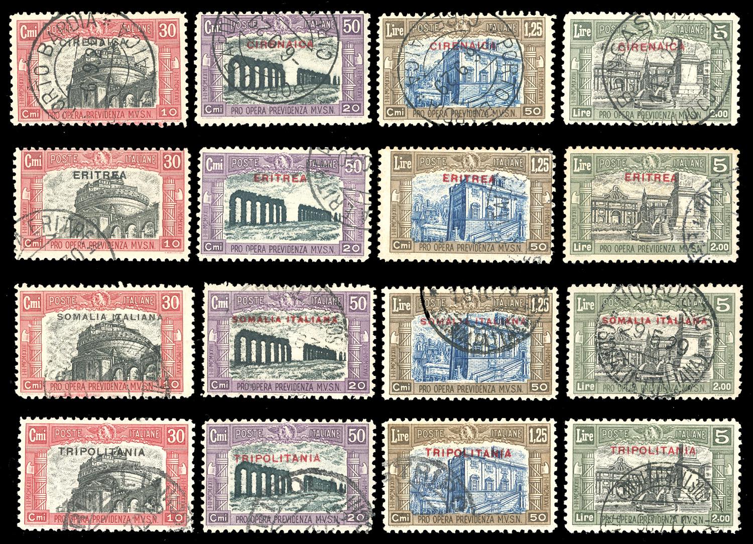 1929 - Milizia, II emissione, giro delle quattro Colonie, serie complete (Cirenaica 49/52,Eritrea 138/141,Somalia 119/122,Tripolitania 50/53), usati con annulli originali, perfetti. Ferrario.
