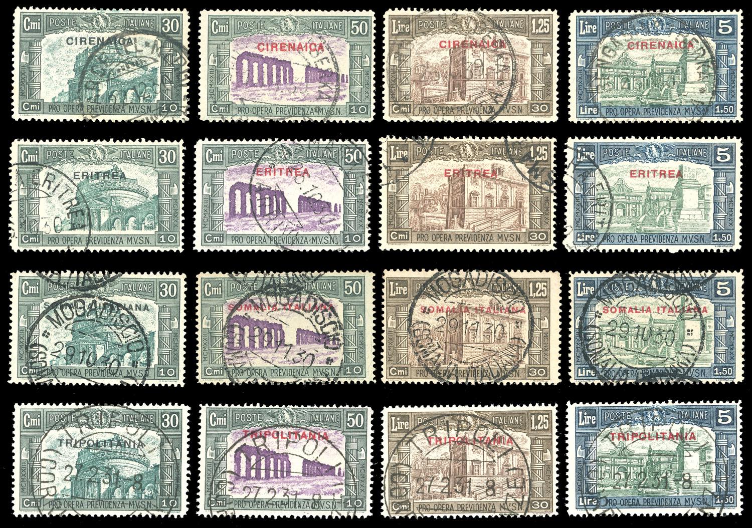 1930 - Milizia, III emissione, giro delle quattro Colonie, serie complete (Cirenaica 68/71, Eritrea 170/173,Somalia 140/143,Tripolitania 69/72), usati con annulli originali, perfetti. A.Diena/Raybaudi per alcuni valori, Ferrario per tutte le serie.