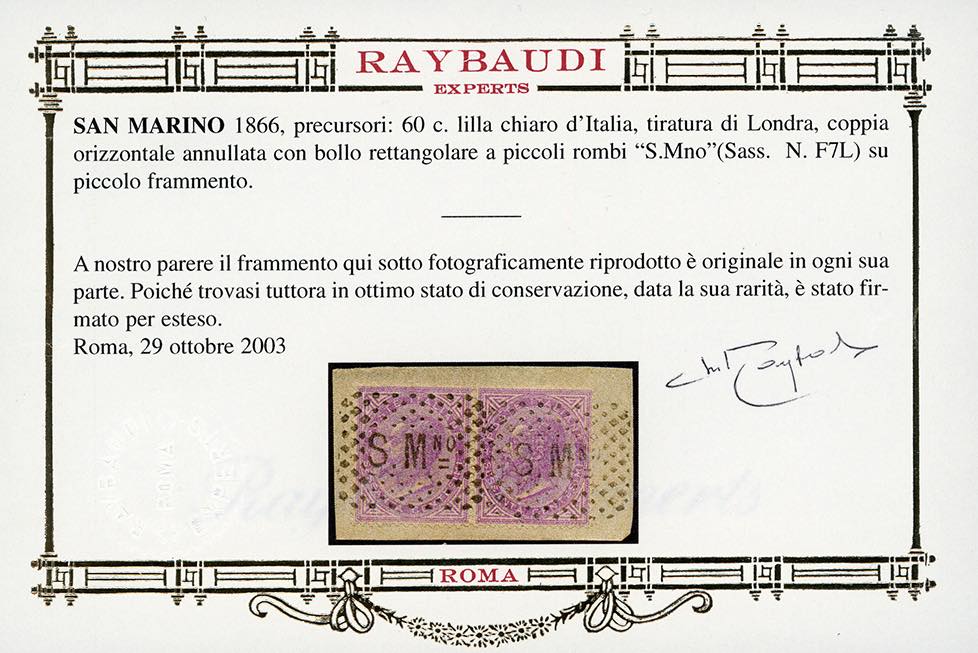 1866 - 60 cent. De La Rue, tiratura di Londra (Regno L21 RSM F7L), coppia, perfetta, usata con il bollo a punti di S.Marino. Splendida ed unica! E.Diena, Sorani, Fiecchi, Chiavarello, Ferrario, cert. Raybaudi.