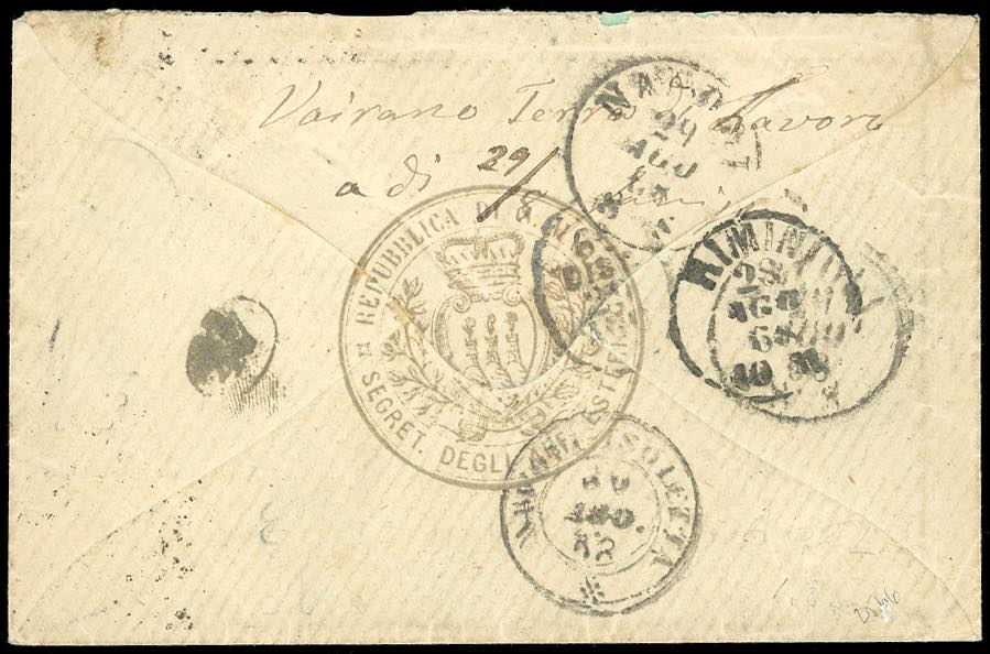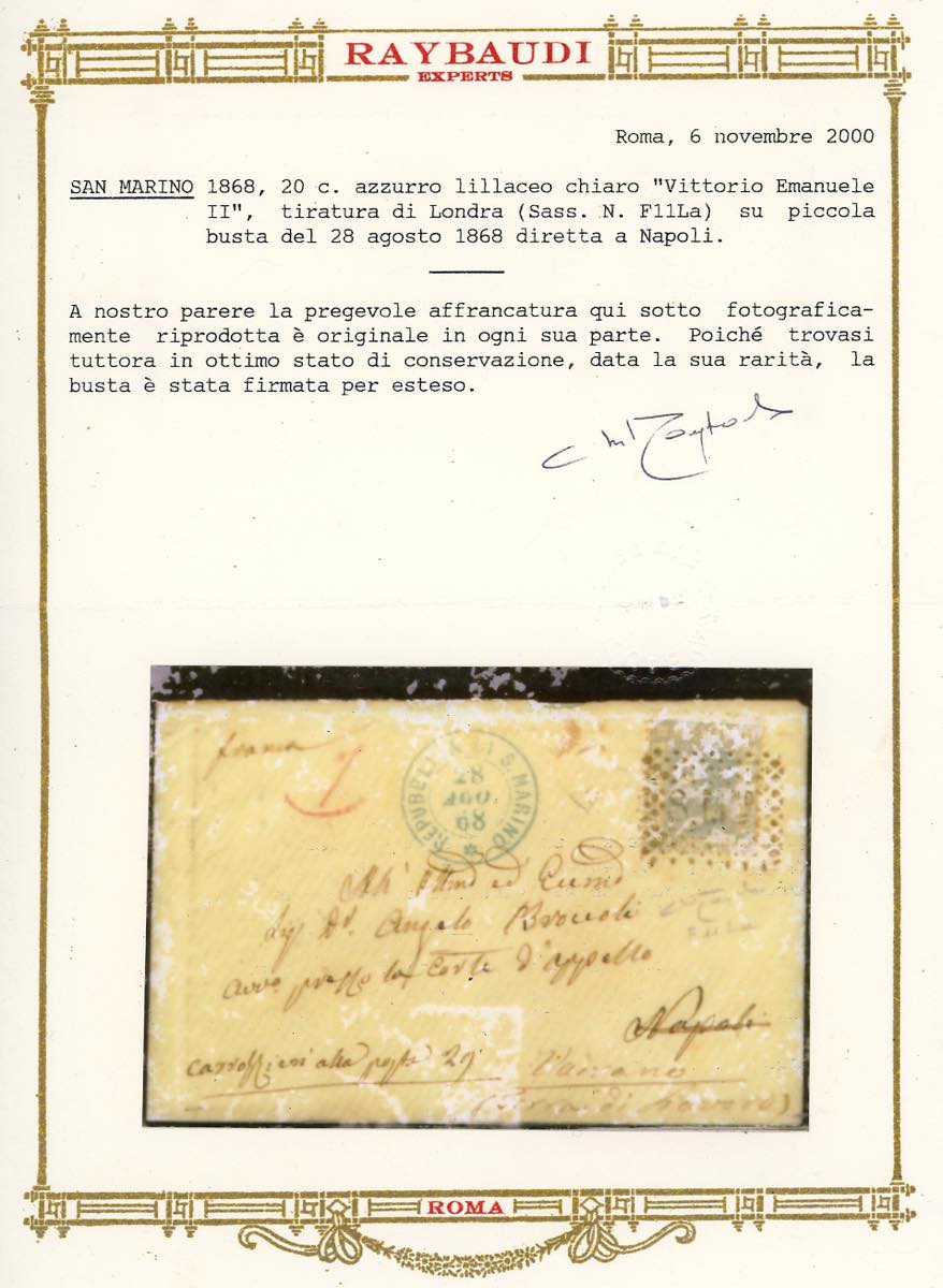 1868 - 20 cent. azzurro lillaceo chiaro, tiratura di Londra (Regno L26a,RSM F11La), perfetto, su busta da S.Marino 28/8/1868, bollo a punti annullatore e doppio cerchio sul fronte, a Napoli, rispedita a Vairano. Rare rispedizione da San Marino. Ferrario, cert. Oro Raybaudi ed E.Diena.