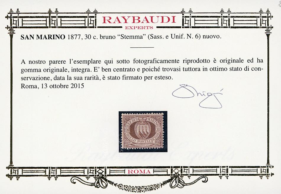1877 - 30 cent. Stemma (6), ben centrato, nuovo, gomma originale integra, perfetto. Due cert. Oro Raybaudi.