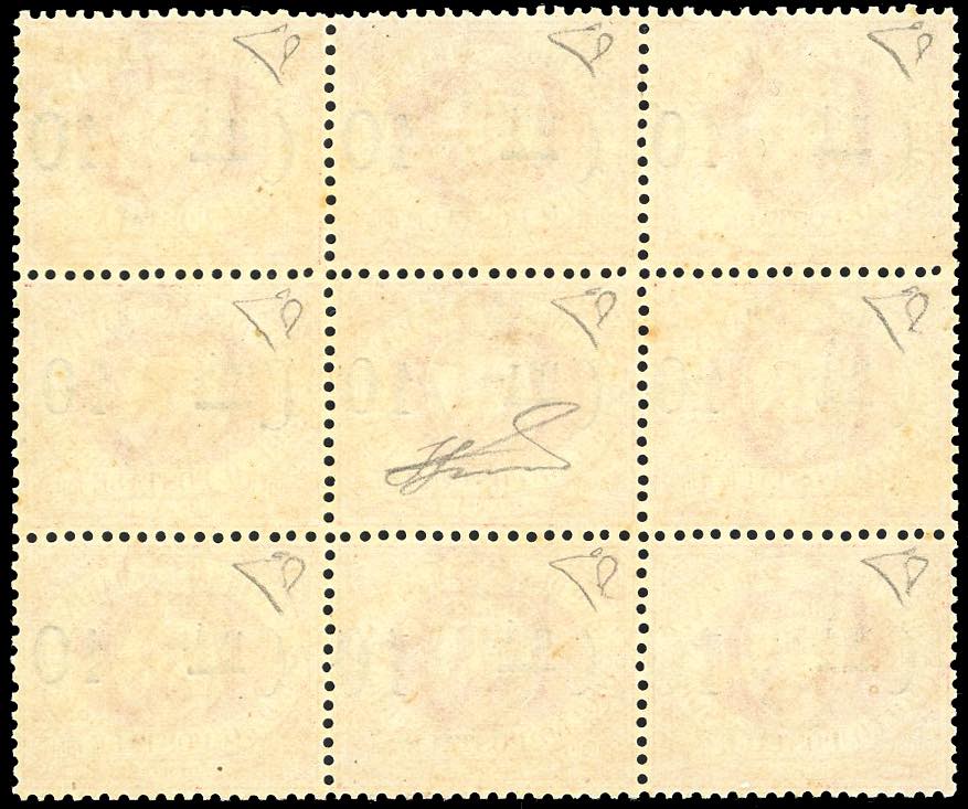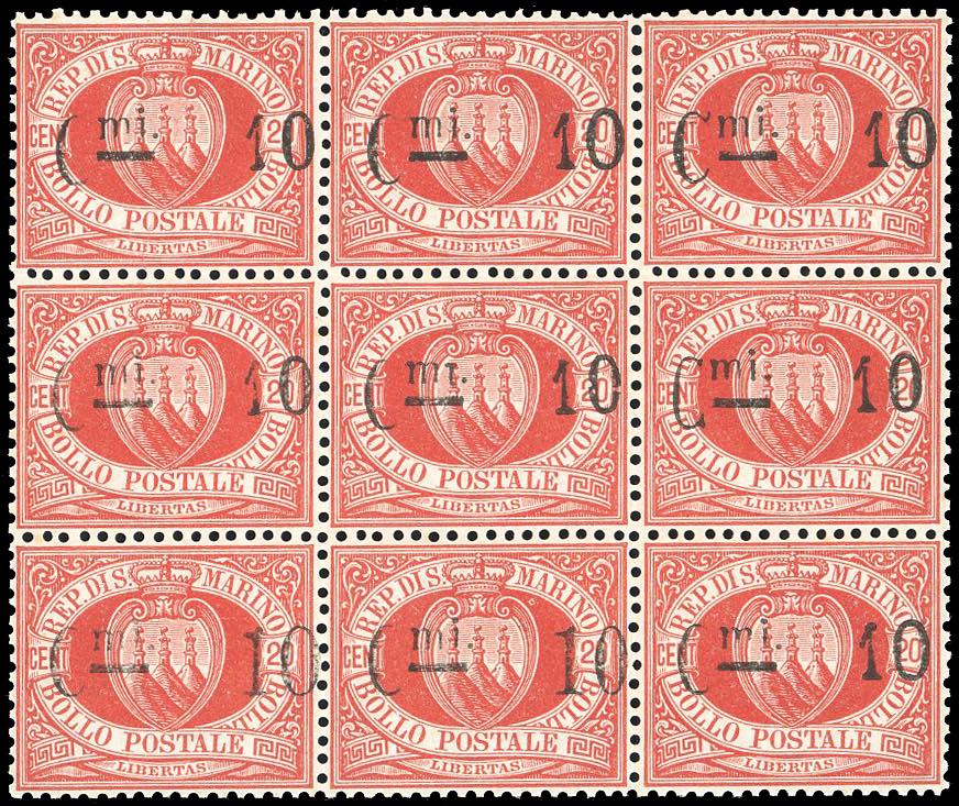 1892 - 10 cent. su 20 cent. soprastampato, blocco di nove esemplari con centratura eccezionale, pos. 12 - 14, 17 - 19, 22 - 24, un esemplare con varietà "i" capovolta e senza punto (10,10o), nuovo, gomma originale integra, perfetto e molto fresco. Splendido. E.Diena, cert. Ferrario.
