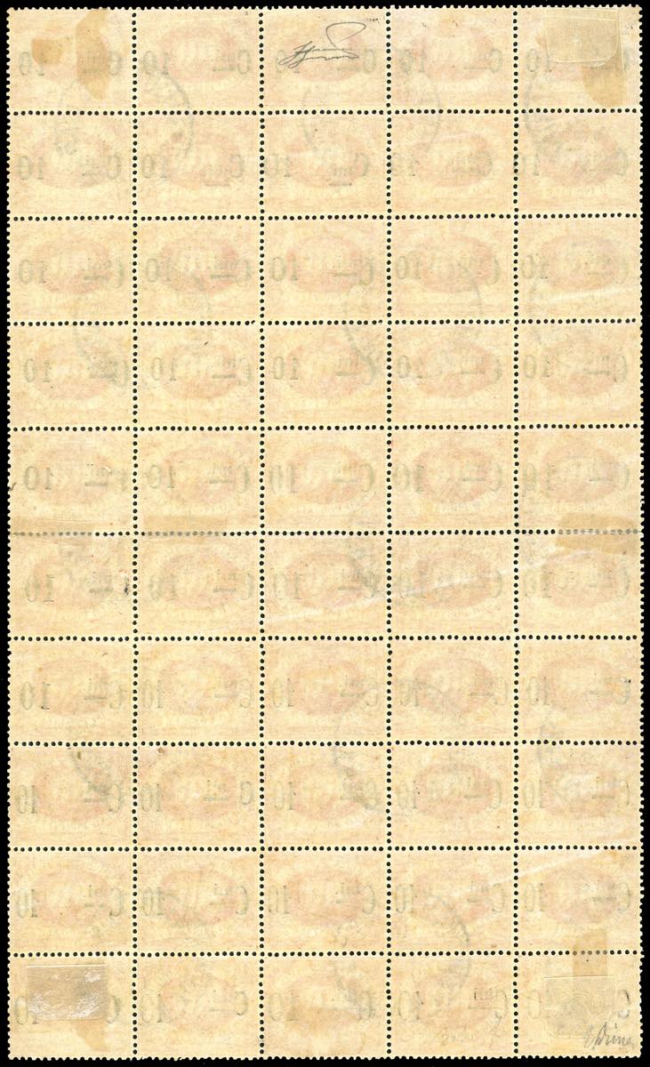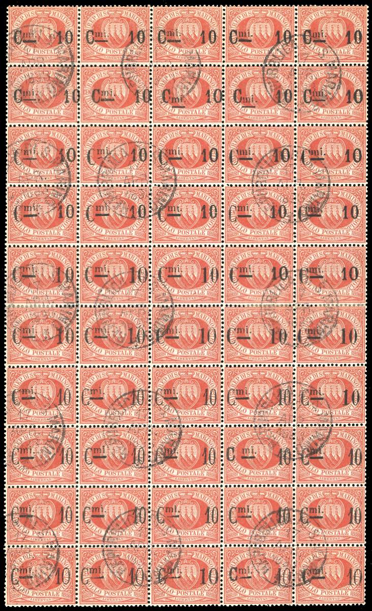 1892 - 10 cent. su 20 cent. soprastampato (10), foglio completo di 50 esemplari, con diverse varietà tipografiche, perfetto, usato a San Marino 17/4/1893. Raro. Emilio Diena, cert. Ferrario.