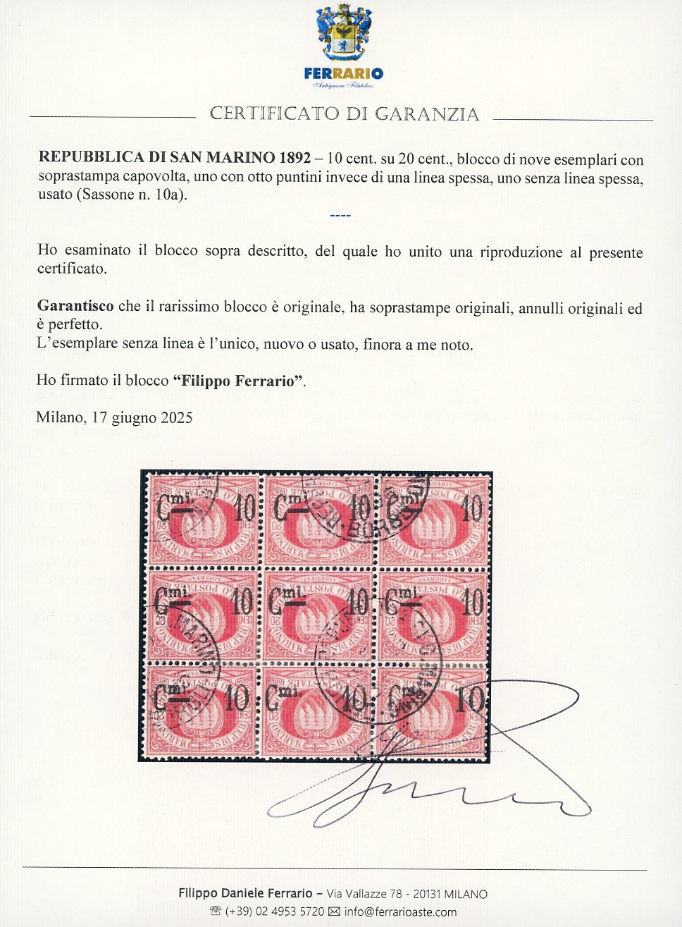 1892 - 10 cent. su 20 cent., blocco di nove esemplari con soprastampa capovolta, uno con otto puntini invece di una linea spessa, uno SENZA LINEA SPESSA, varietà rarissima e non catalogata (10a), usato, perfetto. INSIEME INEDITO ED UNICO! Per specialista. Cert. Ferrario.