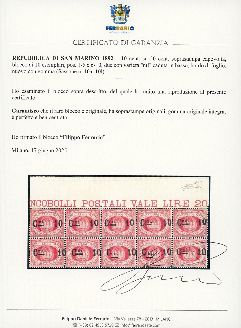 1892 - 10 cent. su 20 cent., soprastampa capovolta, blocco di 10 esemplari, pos. 1-5 e 6-10, due con varietà "mi" caduta in basso (10a,10l), ben centrato, bordo di foglio, nuovo, gomma originale integra, perfetto. Molto raro. Cert. Ferrario (cat.Sassone oltre 20.000 € considerando la centratura).