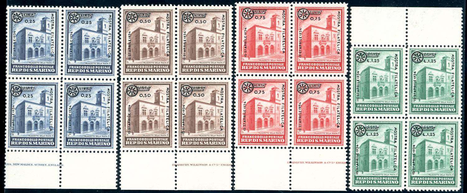 1934 - Soprastampati "Mostra Filatelica", serie completa (180/183), blocchi di quattro, tutti bordo di foglio, nuovi, gomma originale ... Leggi tutto