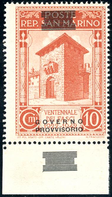 1943 - 10 cent. soprastampa "Governo Provvisorio" di tipo diverso fortemente spostata in basso e sbarrette ripetute anche sul bordo ... Leggi tutto