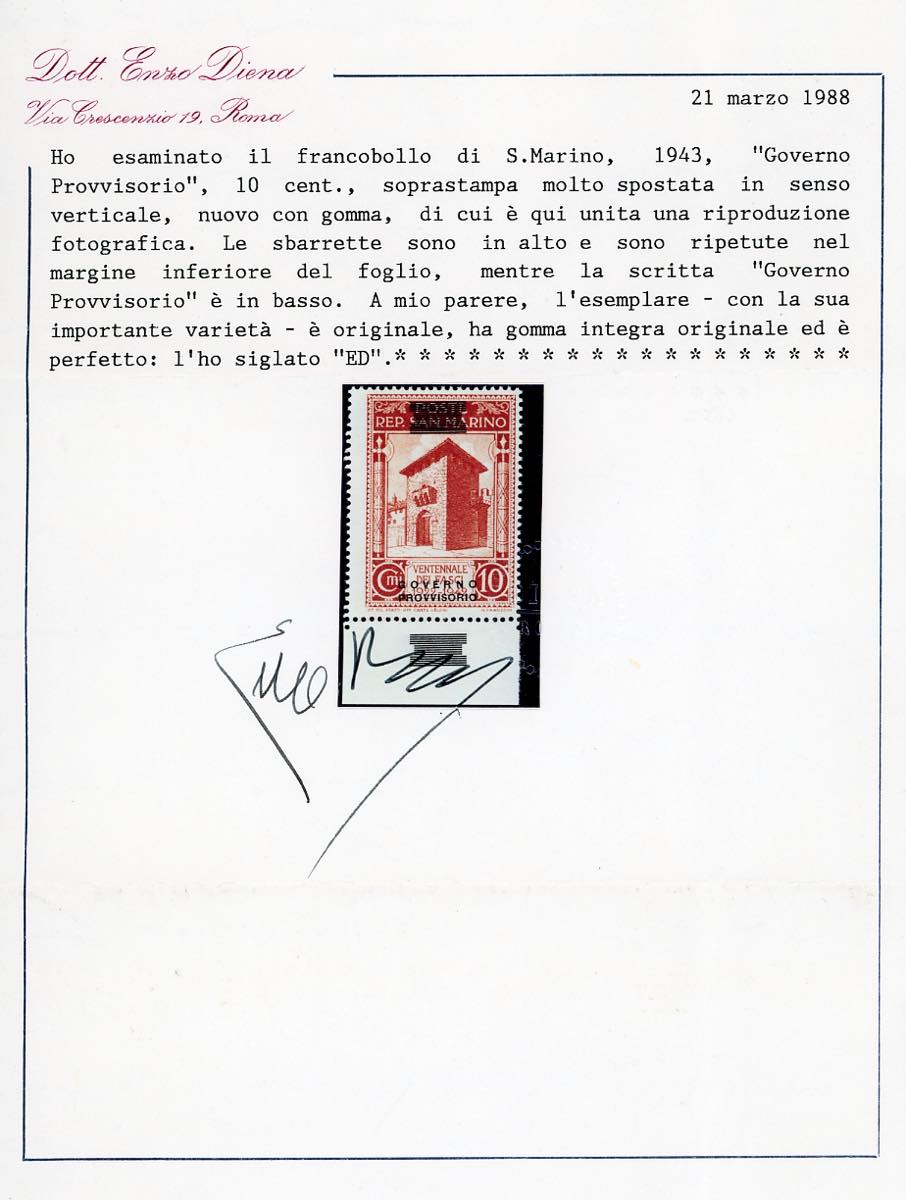 1943 - 10 cent. soprastampa "Governo Provvisorio" di tipo diverso fortemente spostata in basso e sbarrette ripetute anche sul bordo inferiore di foglio (267Aha), gomma originale integra, perfetta. Bello e raro. Cert. E.Diena.