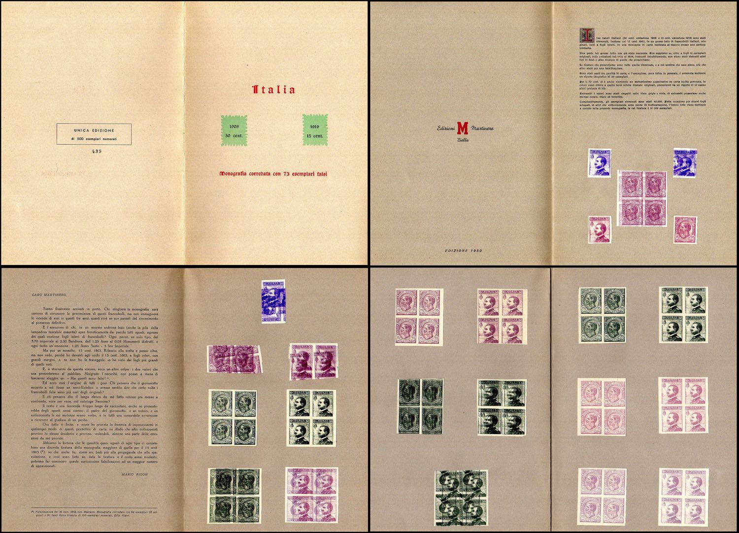1908/19 - 50 cent. Michetti, 15 cent. Leoni (85,108), libretto "Martinero" contenente 73 riproduzioni dei due francobolli, in blocchi e con ... Leggi tutto