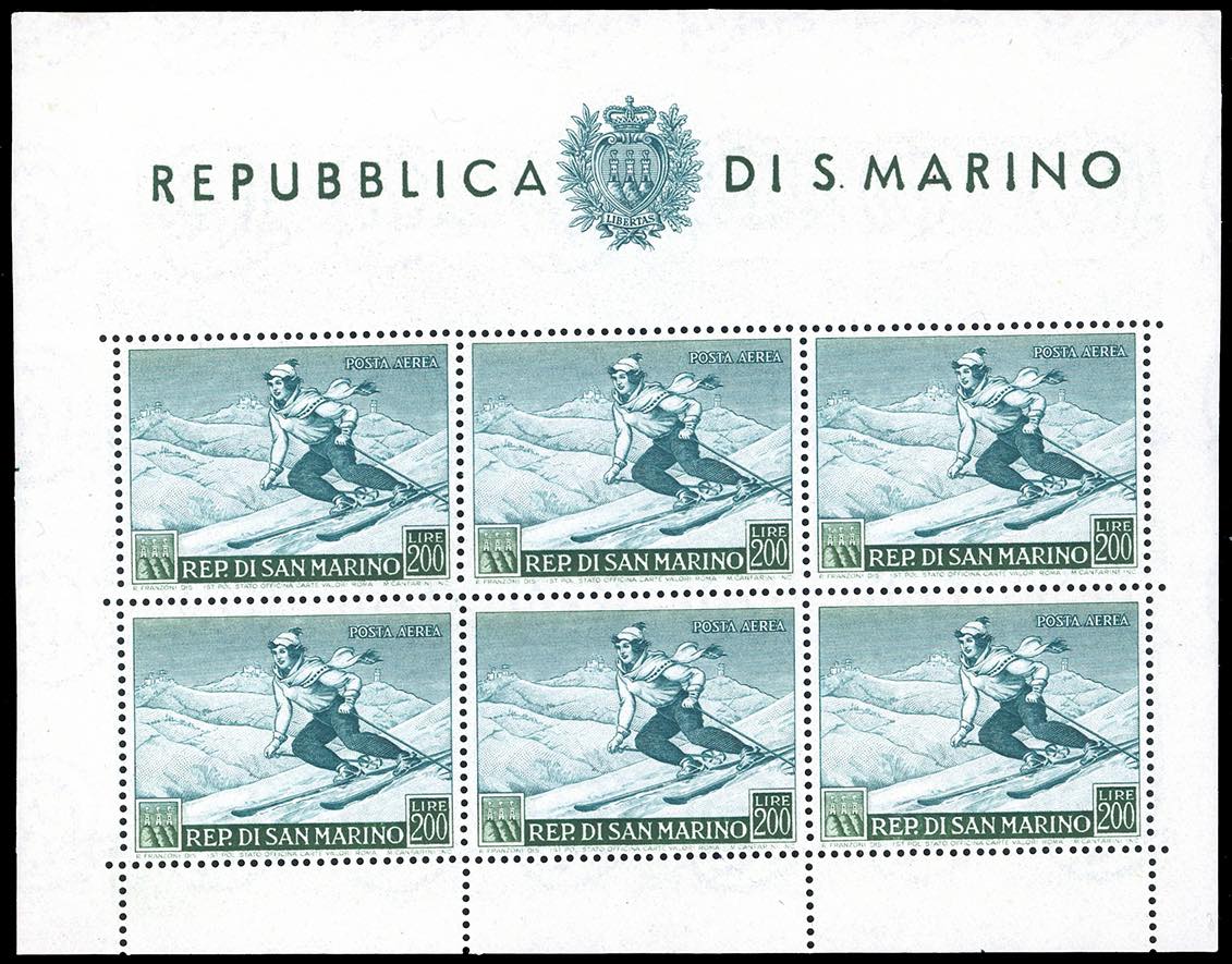 1953 - 200 lire Sciatrice, foglietto (15), nuovo, gomma originale integra, perfetto. Ottima qualità, Cert. Ferrario.