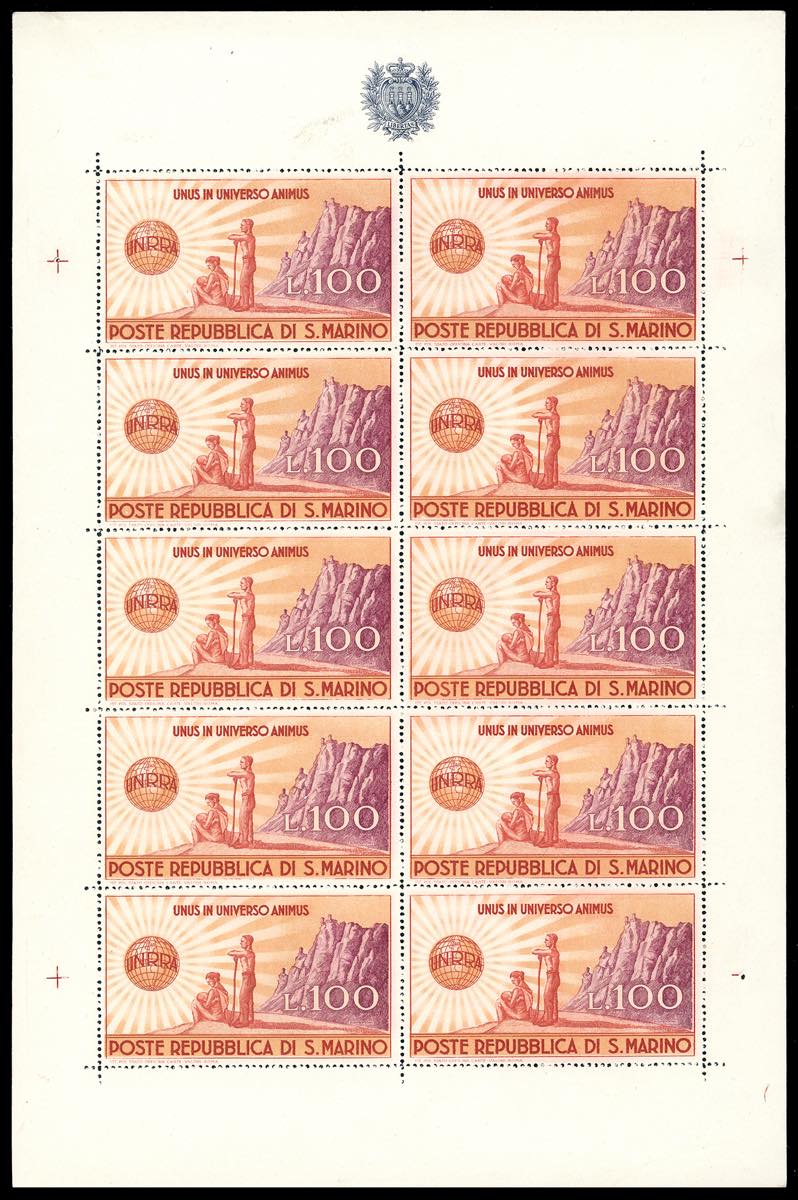 1946 - 100 lire UNRRA, minifoglio (6), nuovo, gomma originale integra, perfetto. Ferrario.