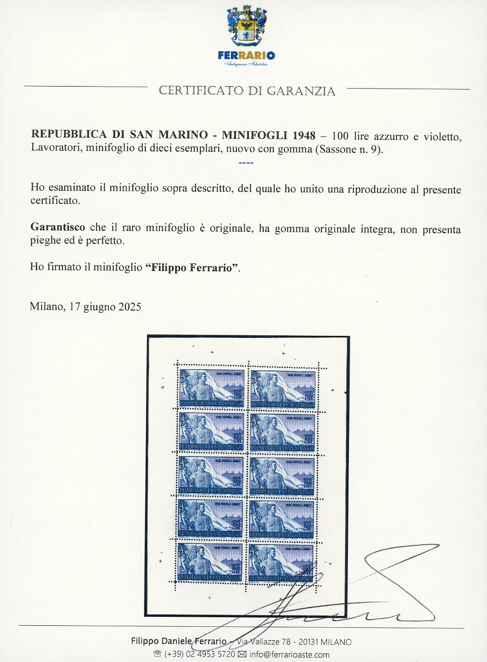 1948 - 100 lire Lavoratori, minifoglio (9), perfetto e non piegato, nuovo, gomma originale integra. Bellissimo. Cert. Ferrario.