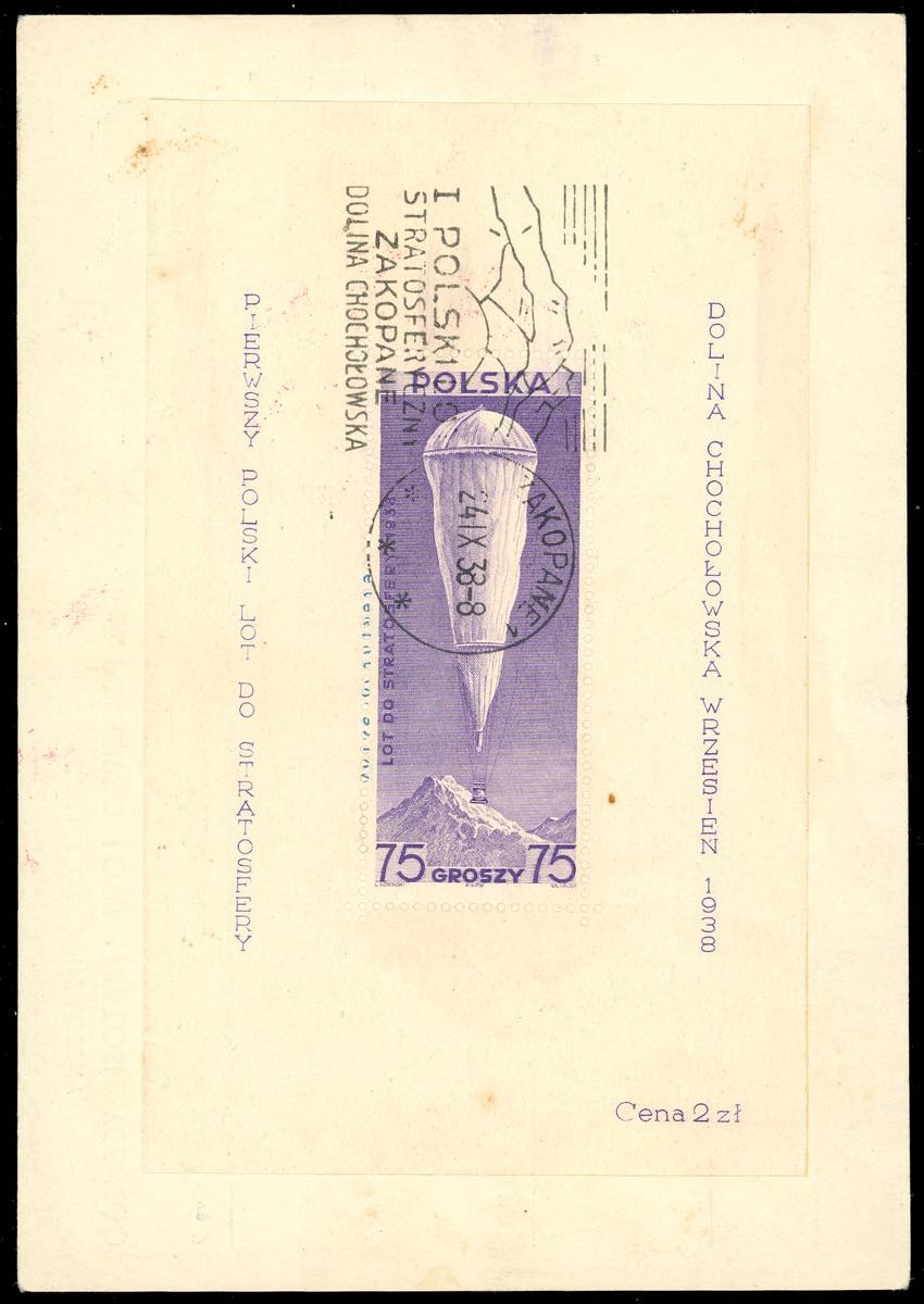 POLONIA FOGLIETTI 1938 - 75 g. Volo nella stratosfera, foglietto (6), perfetto, al verso di cartoncino commerativo con annullo speciali del volo del 24/9/1938.