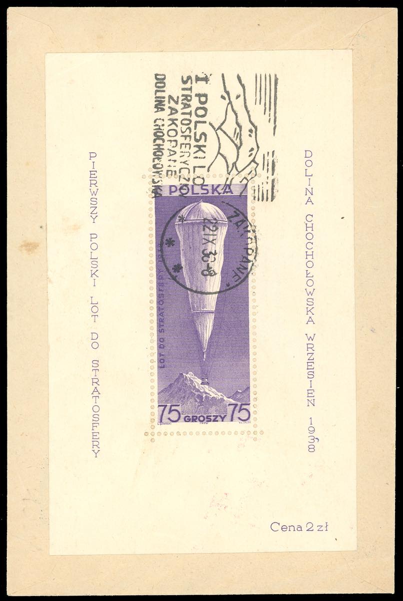 POLONIA FOGLIETTI 1938 - 75 g. Volo nella stratosfera, foglietto (6), perfetto, al verso di cartoncino speciale con annulli celebrativi del volo del 24/9/1938.