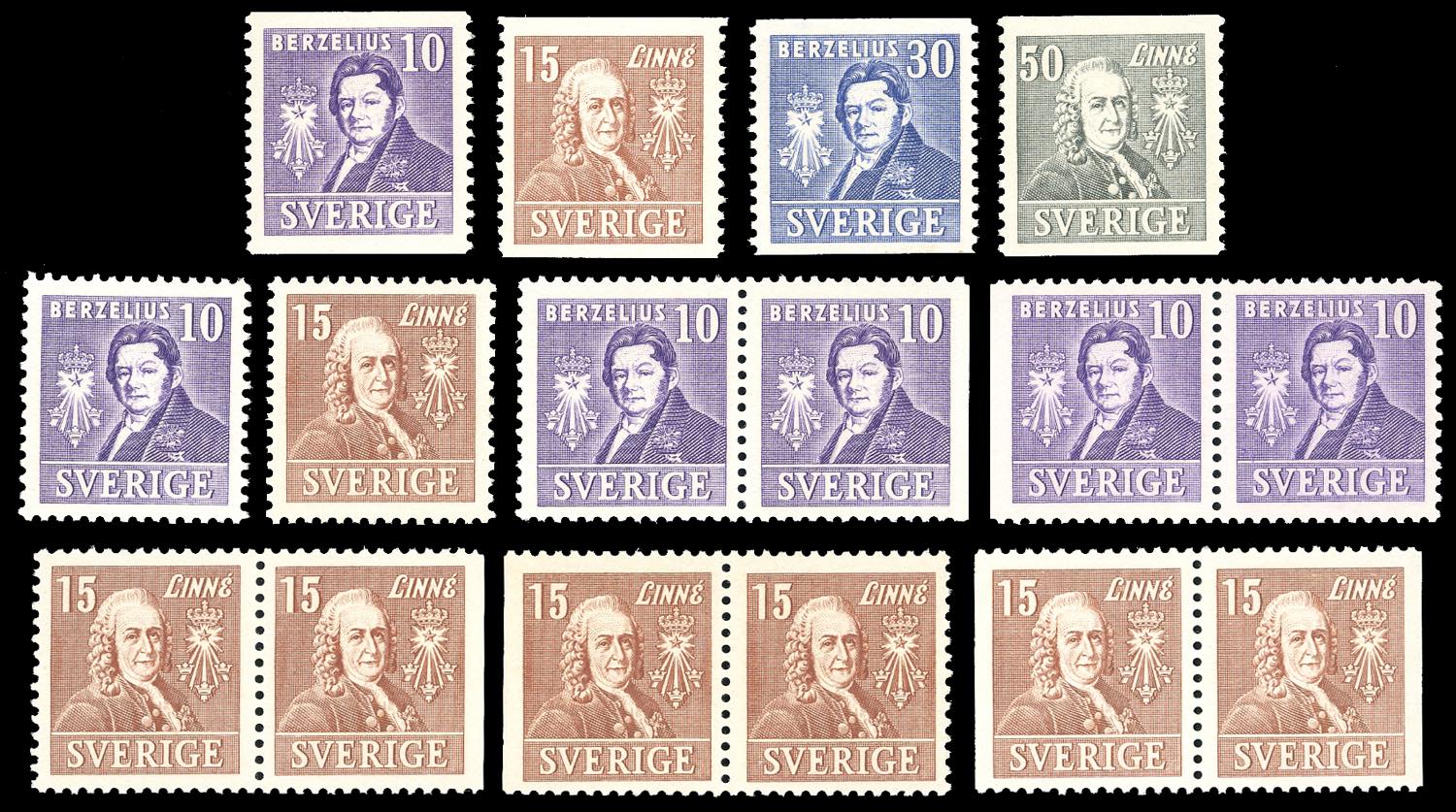 SVEZIA 1939 - Accademia Reale delle scienze, serie completa con le diverse combinazioni di dentellatura (275/278,275a,276a,275e,275f,276e,276f,276d), nuovi, gomma originale integra, perfetti. Cert. Sorani per quattro coppie.