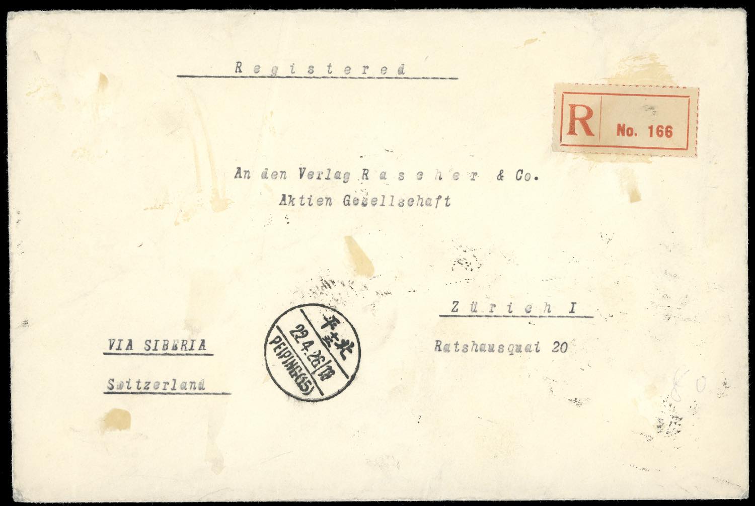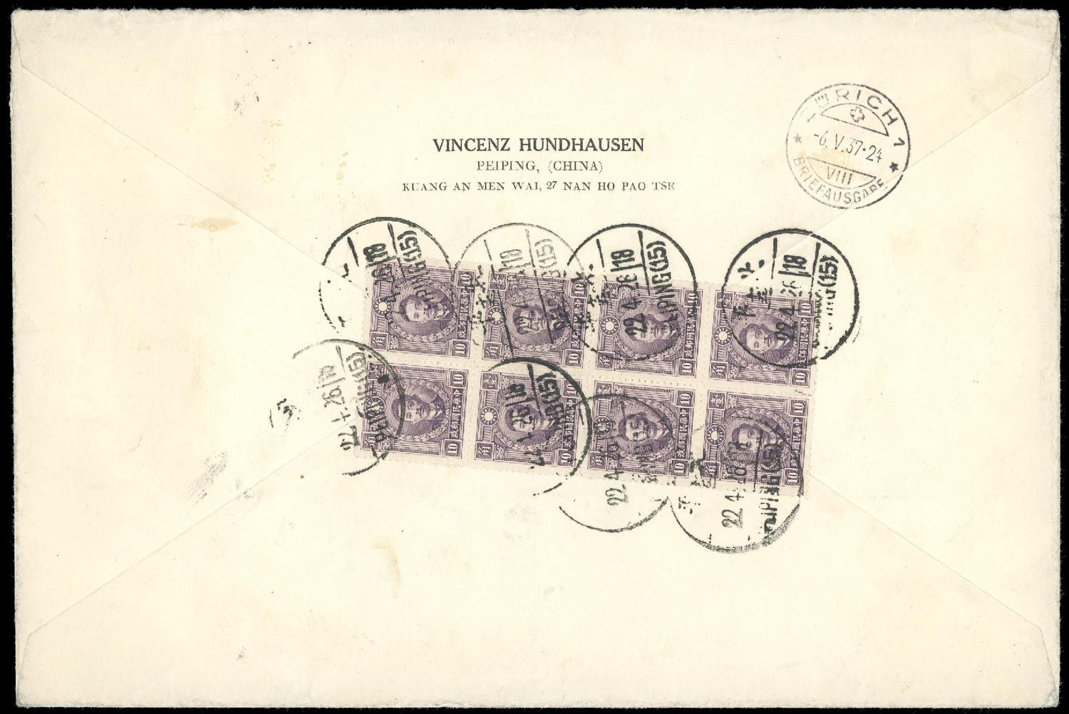 1937 - 10 cent. Mi. n. 255, block of eight, perfect, on registered cover from Peiping to Zurich.