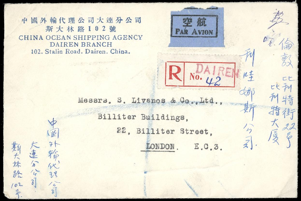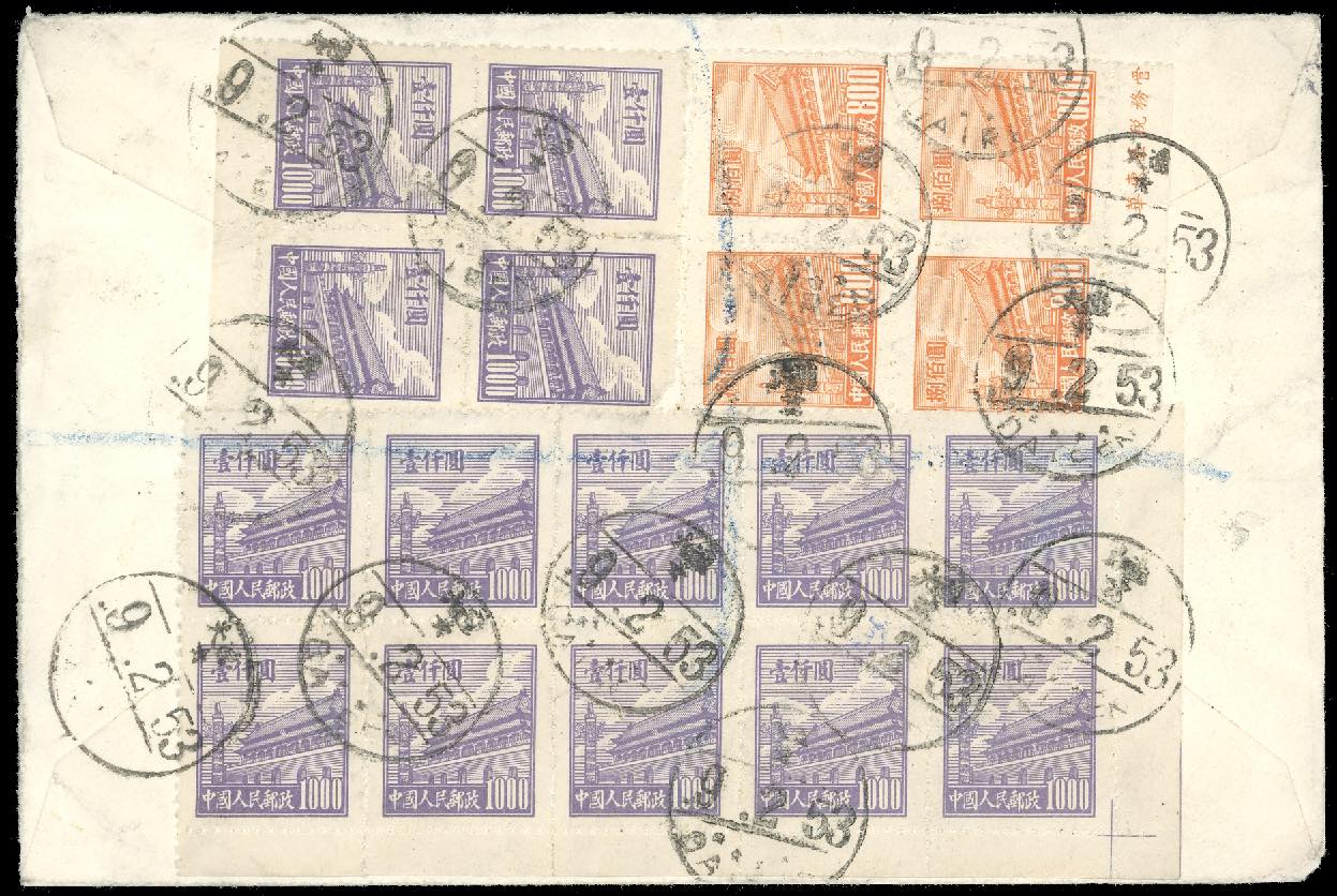 1953 - 800 $ orange, block of four, 1.000 $ violet, block of four and block of ten, on airgram registered from Dairen 9/2/1953 to London. Interesting multiple franking.