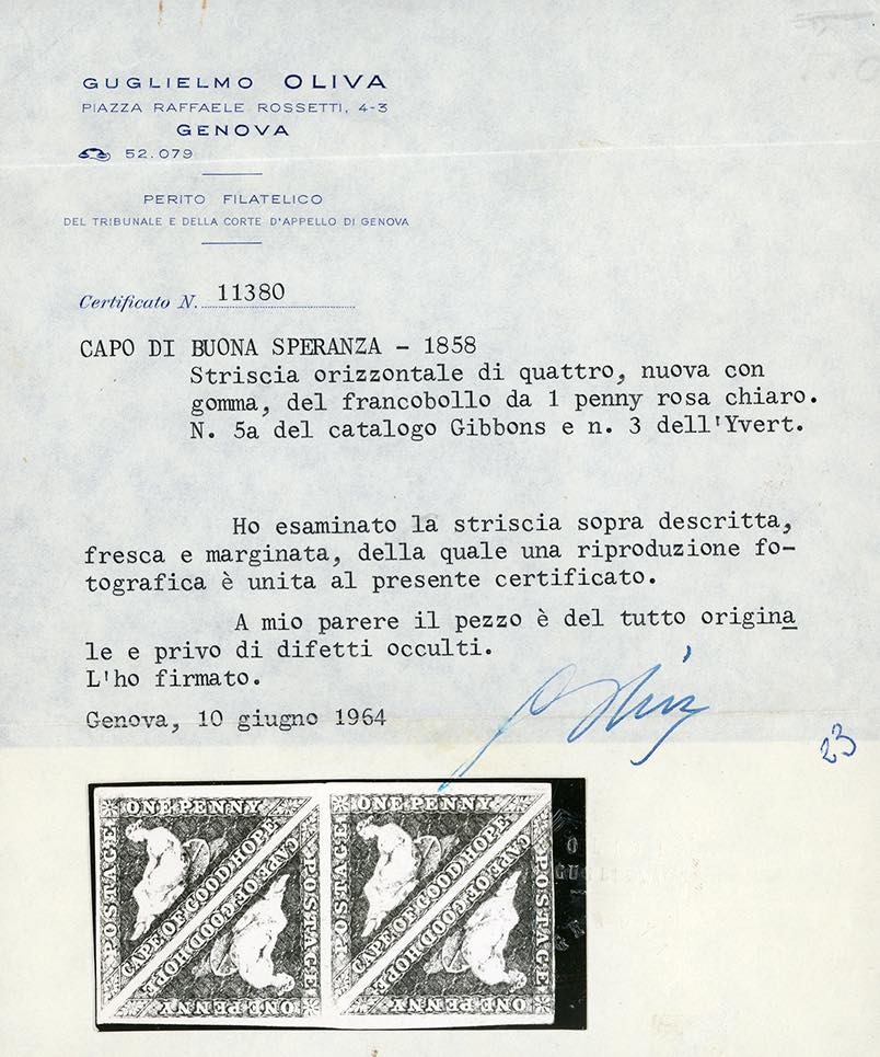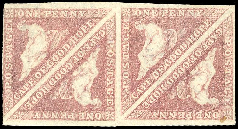 CAPE OF GOOD HOPE-BRITISH COLONIES 1858 - 1 p. rosa, (Yv.3,S.G.5a), striscia di quattro, nuova, gomma originale, MLH, integra per due esemplari, MNH, tre ottimi margini, giusta a sinistra, perfetta. A.Diena, cert. G.Oliva.