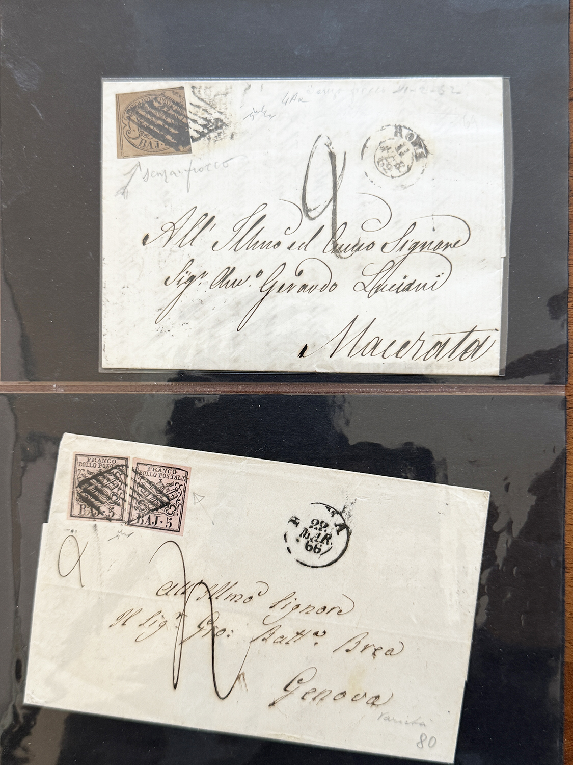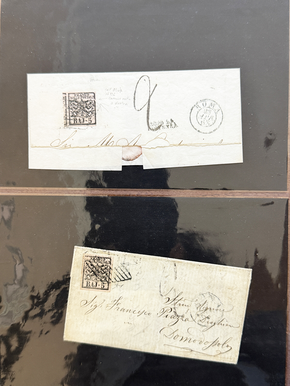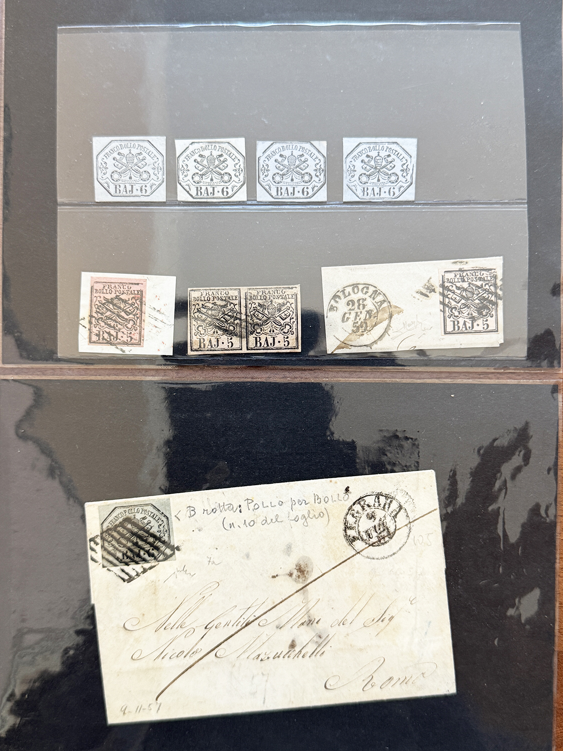 STATO PONTIFICIO 1852/1867 - Bella collezione di varietà di clichè sui francobolli della I emissione, prevalentemente su lettera. Insieme di difficile reperibilità, ottima sia per studio che per dettaglio. Ex collezione Imperato.