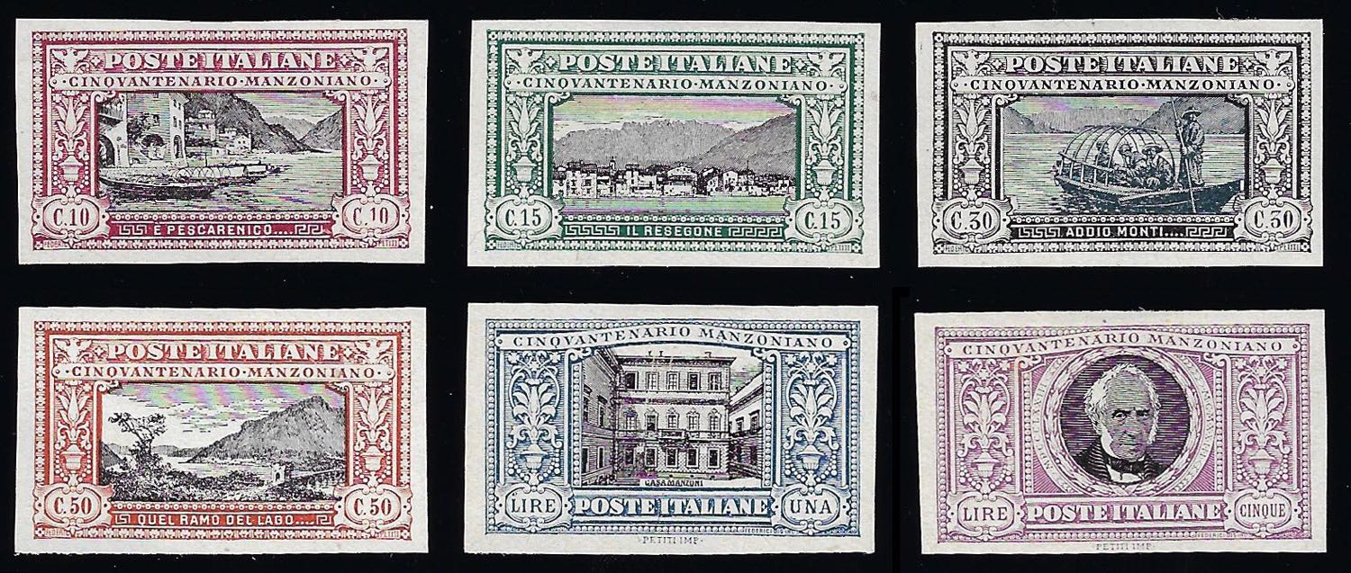 1923 - Manzoni, prove d'archivio non dentellate (P151/156), nuove senza gomma come sempre, perfette. Belle.