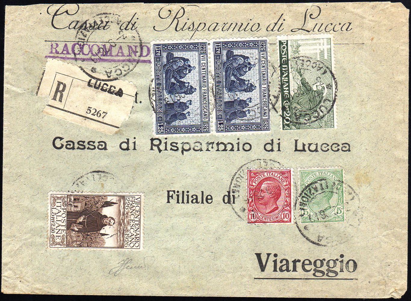 1926 - 5 + 2,50 lire, 20 cent., 1,25 lire, coppia, San Francesco, perfetti, con 5 e 10 cent. Leoni (197+192+199+81+82), su raccomandata da Lucca 3/9/1926 a Viareggio. Ferrario.