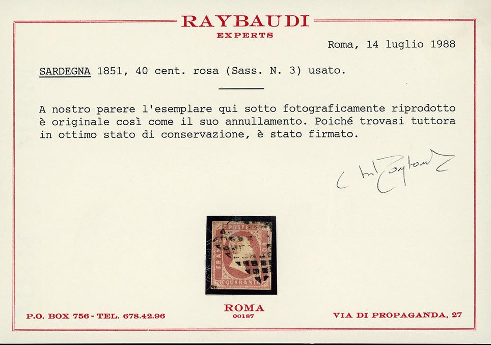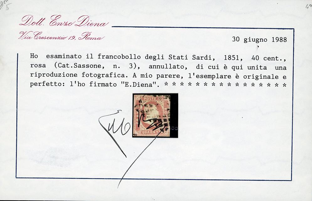 1851 - Prima emissione, serie completa (1/3), usati, perfetti. Il n. 1 cert. E.Diena 1987, il n. 2 firmato A.Diena, il n. 3 firmato Emilio e Alberto Diena, cert. Raybaudi ed Enzo Diena 1988.