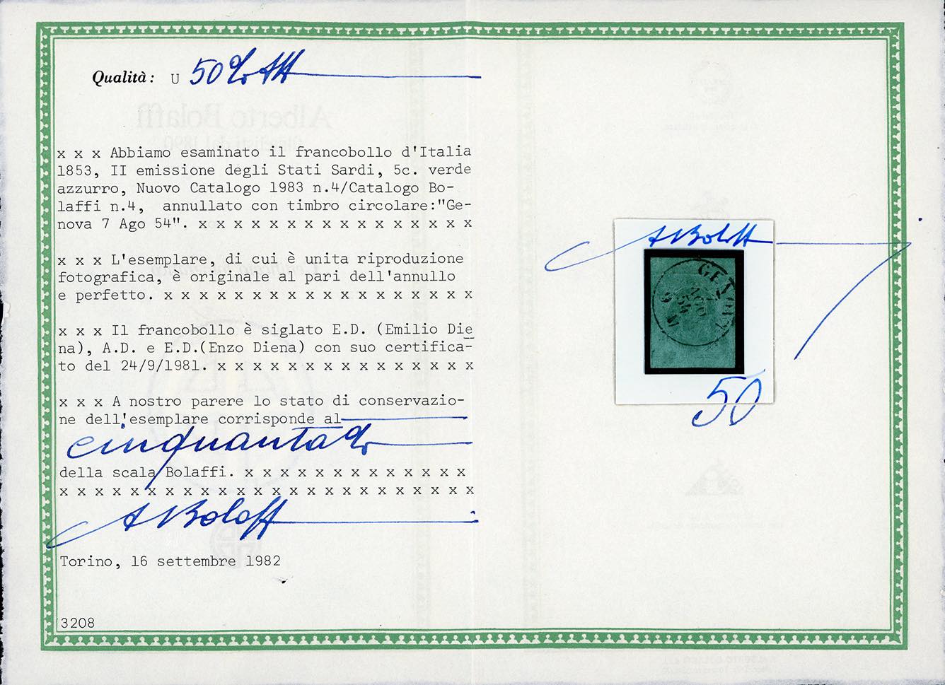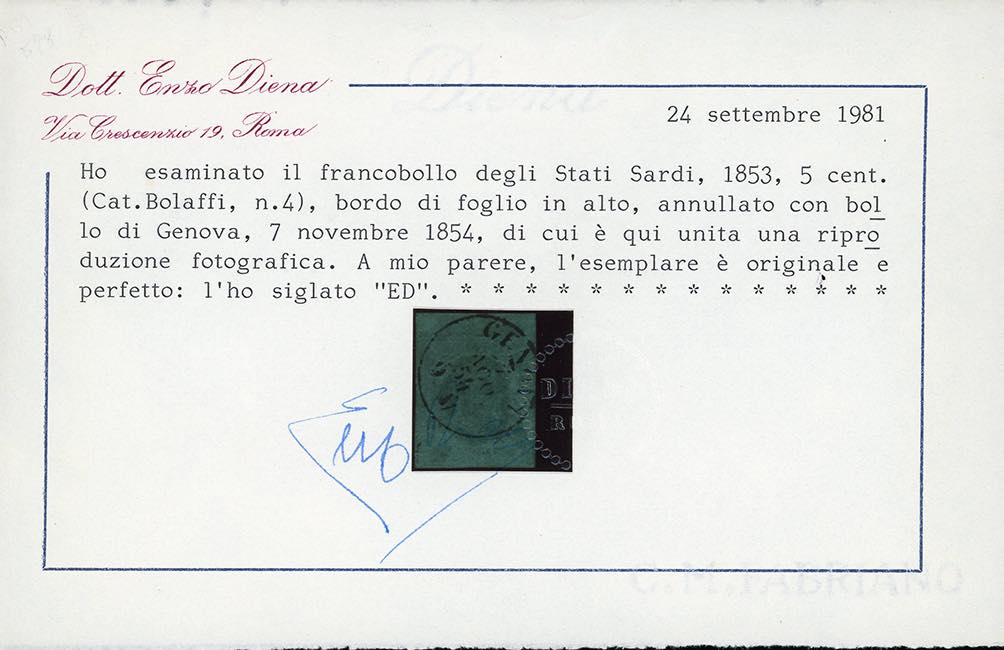 1853 - 5 cent. verde (4), ampio margine di foglio superiore, perfetto, usato a Genova. Bellissimo. Em. e A.Diena, cert. E.Diena 1981 e ... Leggi tutto