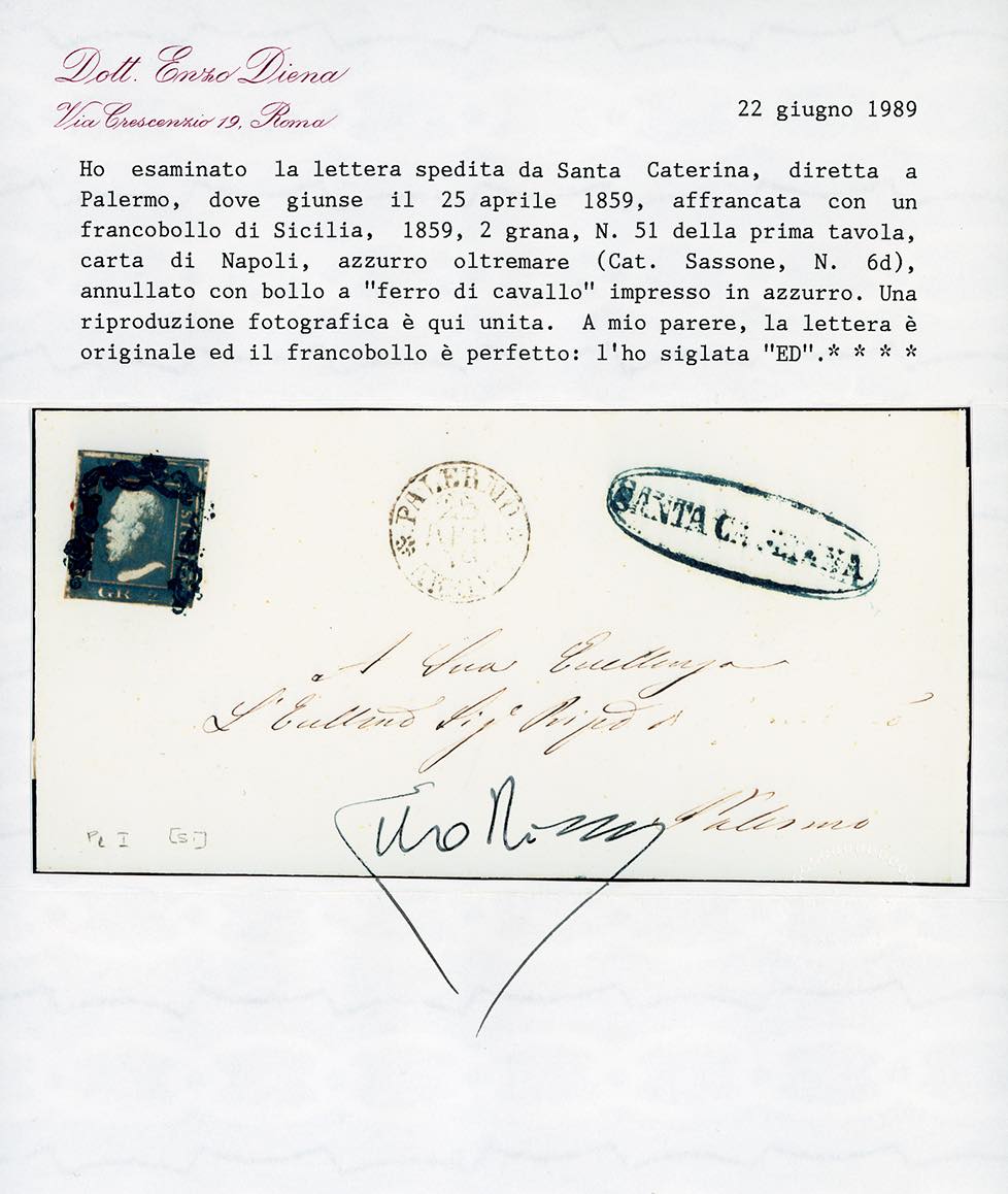 1859 - 2 grana azzurro oltremare, carta di Napoli, I tavola, pos. 51, stampa fortemente oleosa (6d), perfetto, su fresca lettera da Santa Caterina, bolli ferro di cavallo e ovale in azzurro (punti 10), a Palermo 25/4/1859, bollo di arrivo al verso. Si tratta di uno dei tre esemplari noti di francobollo da 2 grana con stampa oleosa su lettera. Per specialista. Cert. E.Diena e Ferrario.