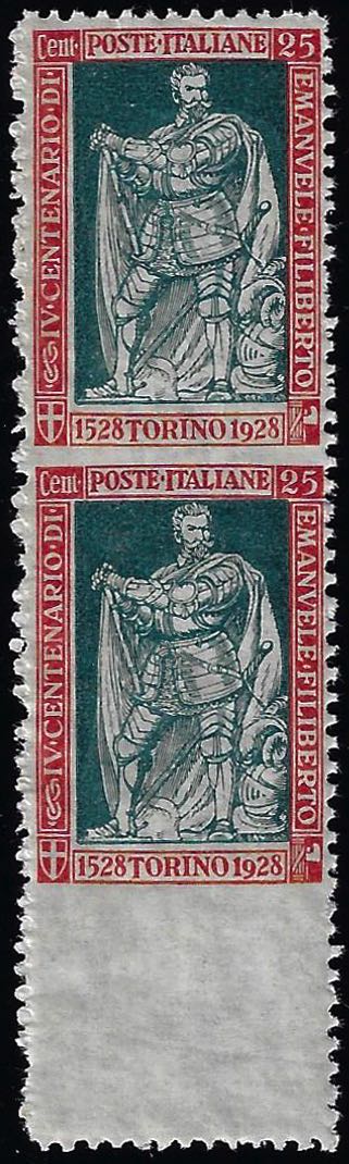 1928 - 25 cent. Emanuele Filiberto, coppia verticale non dentellata al centro e in basso (227o), perfetta, gomma integra. Molto bella. ... Leggi tutto