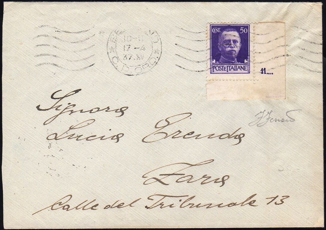 1937 - 50 cent. Imperiale (251), angolo di foglio con numero di cilindro '11….' a destra, anziché a sinistra, perfetto, su fresca bustina diretta a Zara. Rarissimo uso probabilmente UNICO! Ferrario.