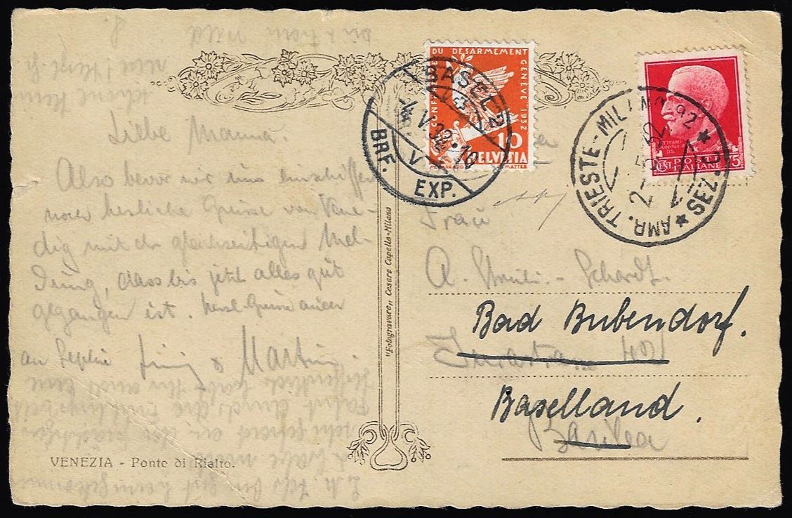 1932 - 75 cent. Imperiale (252), perfetto, su cartolina da Venezia, annullato con il bollo dell'ambulante Trieste - Milano 2/5/1932, a Basilea, rispedita a Baselland dopo essere stata riaffrancata con 10 cent. Conferenza sul disarmo (Svizzera 255). Bella mista di rispedizione. A.Bolaffi.
