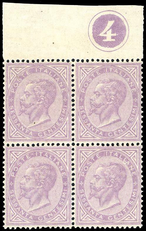 1866 - 60 cent. De La Rue, tiratura di Torino (T21), blocco di quattro, bordo di foglio in alto con numero di tavola 4 in cerchio, nuovo, ... Leggi tutto