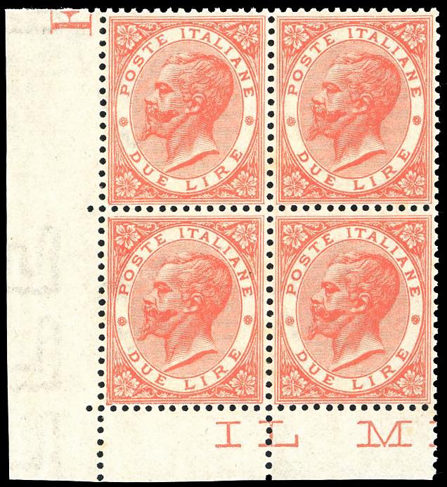1866 - 2 lire De La Rue, tiratura di Torino (T22), ottima centratura, blocco di quattro, angolo di foglio, nuovo, gomma originale integra, perfetto. Ottima qualità. Ferrario.