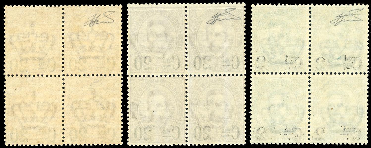 1890/91 - Soprastampati (56/58), blocchi di quattro, buona centratura, nuovi, gomma originale integra, perfetti. Splendidi e rari! Cert. ... Leggi tutto